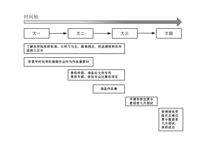 在以上工作都做的差不多的时候,接下来就是时刻关注目标院校的研究生招生官网,以东华为例,可以在每年的1月中旬在“东华大学研究生招生网”上看到夏令营的招生通知以及7月中旬左右看到九月面试的通知,在通知发布以后就可以按照通知中的要求来准备相应的材料,包括但不限于三年以来的成绩单、申请表、个人陈述、推荐信、获奖和论文、专利的证明材料以及作品集。最后寄送材料的时候一定注意作品集的装帧和材料的条理性,最好把各项文件进行分类装订,作品集也不要用很劣质的纸张打印,最好用价格比较贵的蝴蝶装之类。所以想要保研的同学大学四年的规划大致如下: