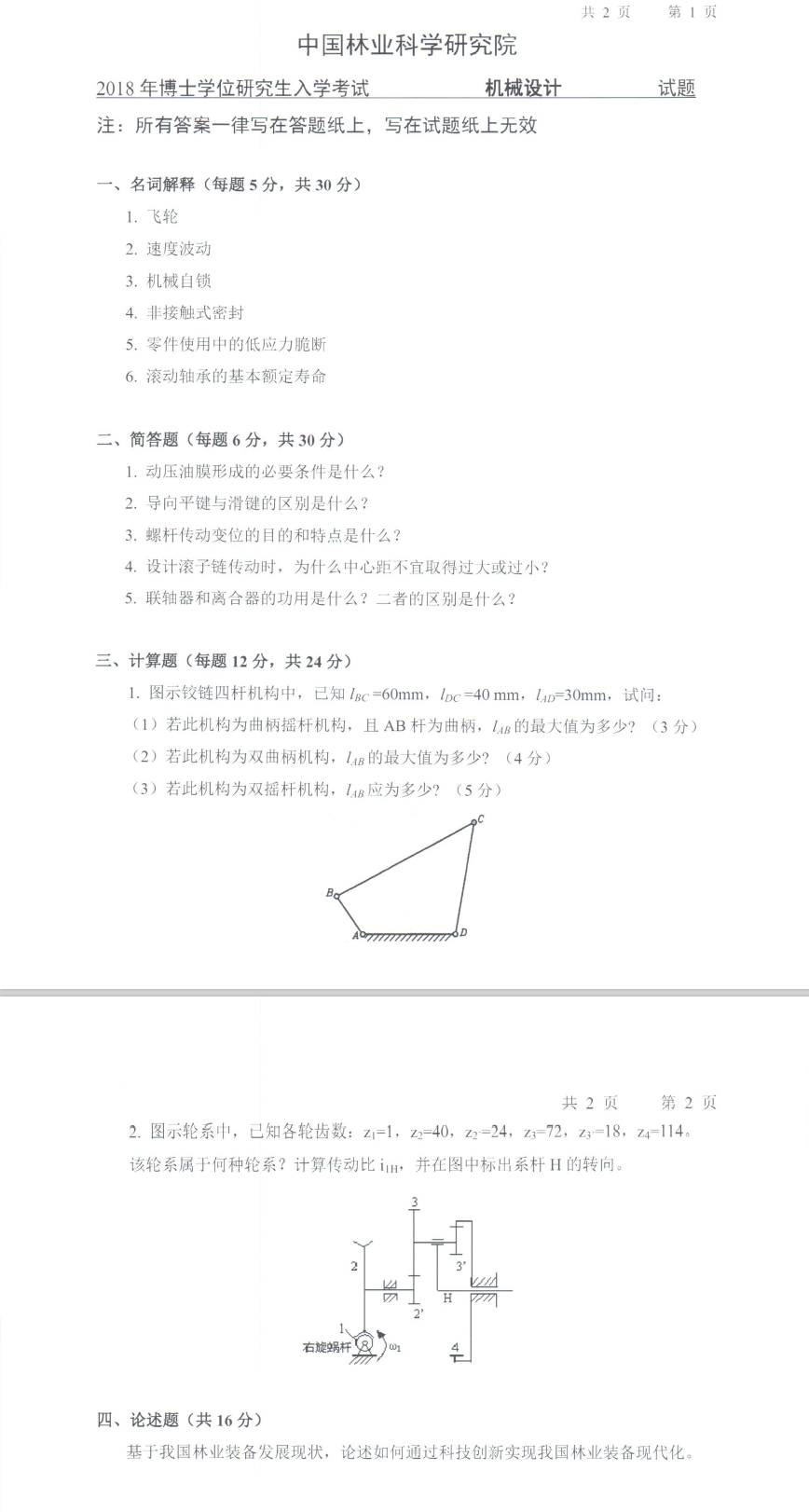 林科院考博辅导班: 2018年中国林业科学研究院博士研究生入学考试机械设计考试真题