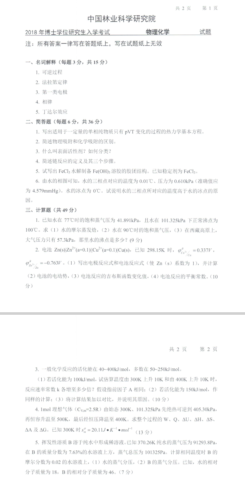 林科院考博辅导班:2018年中国林业科学研究院博士研究生入学考试3006物理化学考试真题