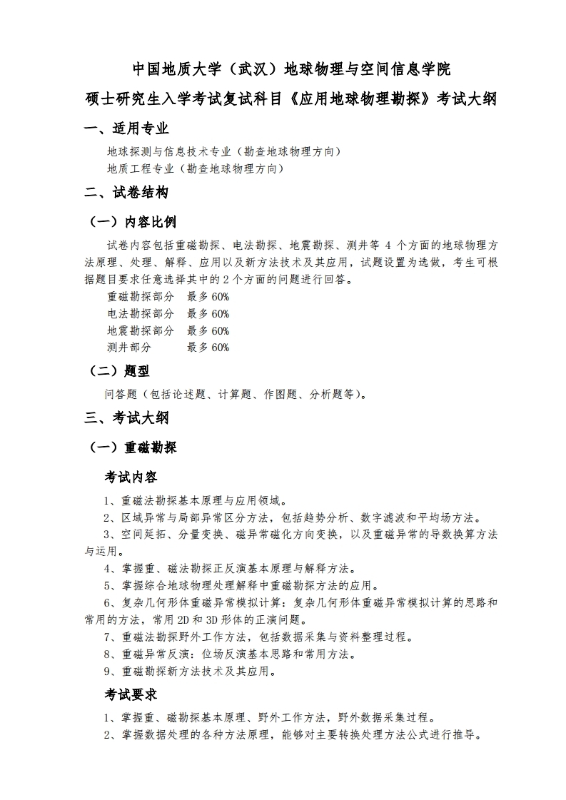 中国地质大学考研辅导班: 中国地质大学(武汉)2020年地球物理学专业-复试科目(地球物理学)笔试大纲