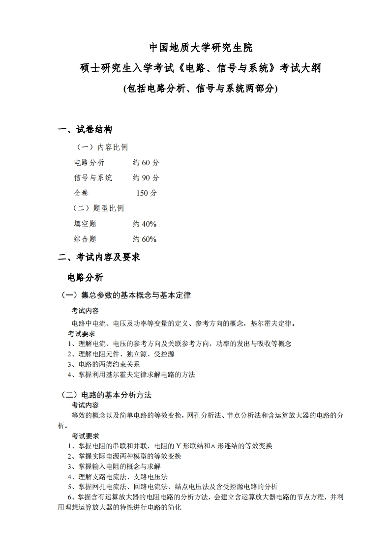 中国地质大学考研辅导班: 中国地质大学(武汉)2020年研究生硕士《电路、信号与系统》考试大纲