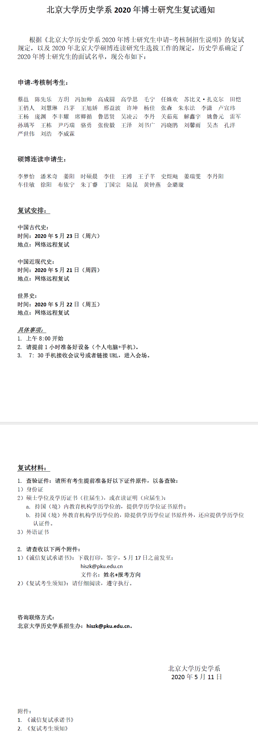 北大考博辅导:2020年北京大学历史学系博士研究生复试通知