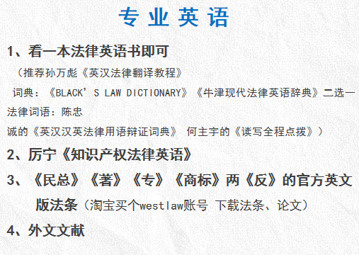 比如我夏令营报的专业主要以民商法和知识产权法专业为主,所以我除了把常用的法律英语用词熟悉了一遍以外(可以去图书馆借一本不太厚的法律英语书,推荐“超律志”公众号),还专门买了厉宁老师那本《知识产权专业英语》并保证每天至少看一篇其中的文章,看第一遍要首先理解文章大意并圈画出一些关键词与专业单词,看的第二遍要每看一句就翻译一句,并要求自己的翻译要保持“法言法语”而不是大白话。