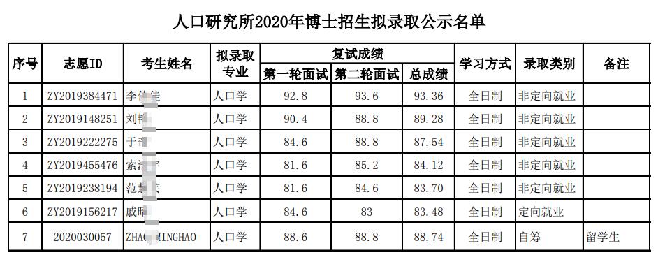 北大考博辅导班:2020年北京大学人口研究所博士招生拟录取公示名单