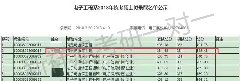 2018年新祥旭学员清华大学信息与通信工程刘同学录取名单: