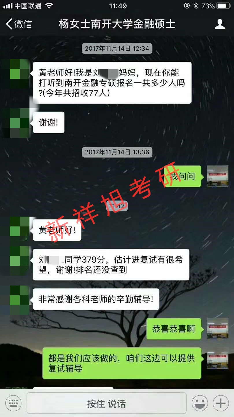 2018年新祥旭学员刘同学南开大学金融专硕与机构工作人员聊天截图: