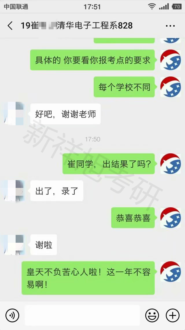 2019年新祥旭学员崔同学清华大学电子工程专业与教务老师聊天截图: