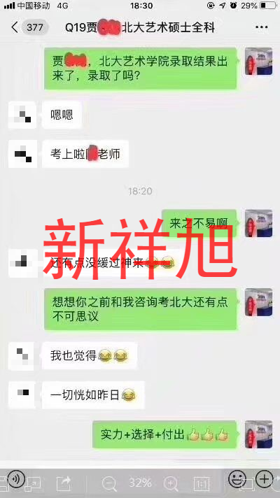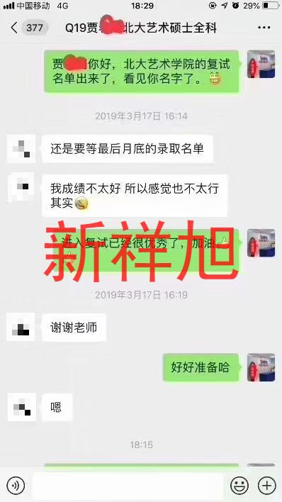 2019年新祥旭学员北京大学艺术专业贾同学与教务老师聊天截图: