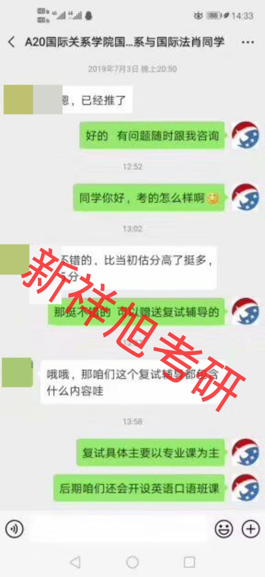 2020年新祥旭学员国际关系学院国际法肖同学与教务老师聊天截图: