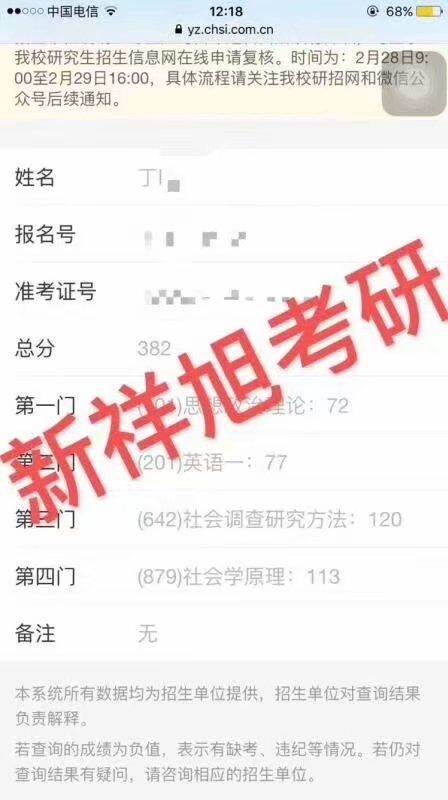 2020年新祥旭学员华东师范大学社会学丁同学成绩截图: