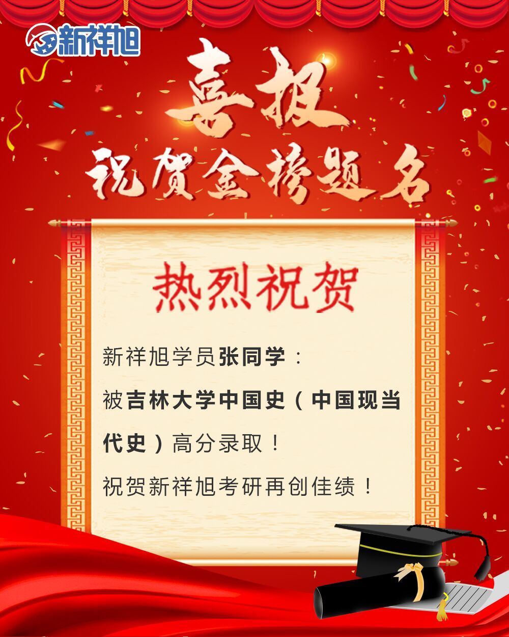 喜报:恭喜新祥旭2020年学员张同学被吉林大学中国史(现当代史)专业成功录取