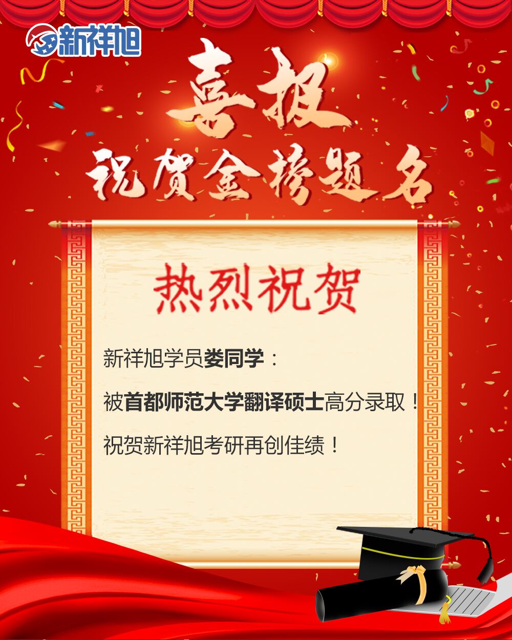 喜报:恭喜新祥旭2020年学员娄同学被首都师范大学翻译硕士成功录取