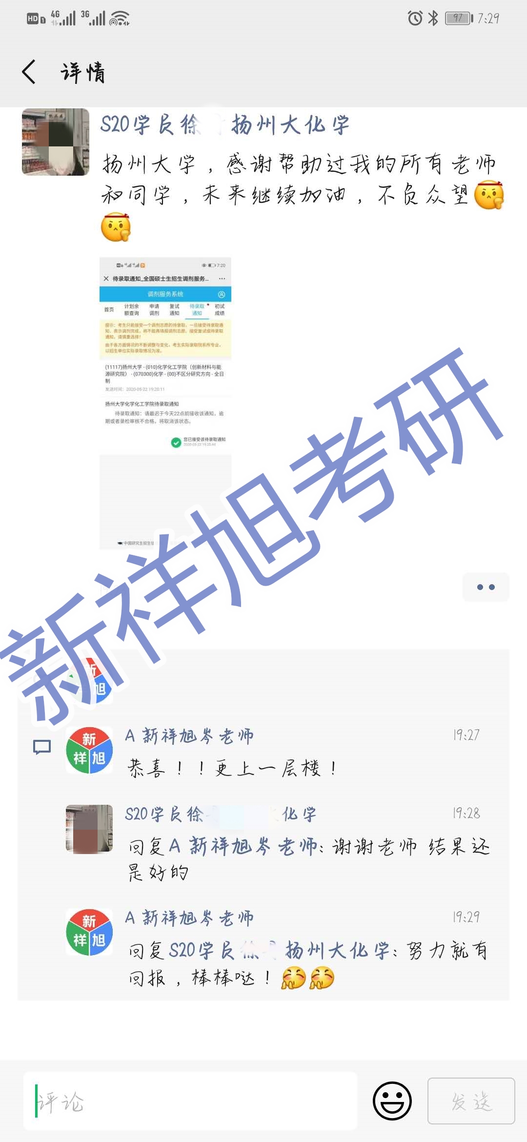 新祥旭2020学员徐同学被录取时朋友圈与新祥旭老师互动截图: