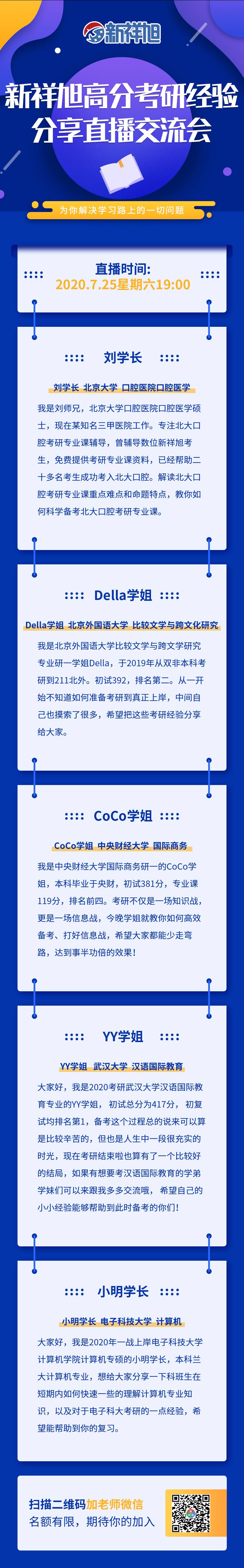 以上是本周六会到场的各大高校的学长学姐,以后的每个周六新祥旭都会为大家安排上经验直播交流会,感兴趣的小伙伴可以持续关注哦!想要参加直播课的同学们可以留言联系小编,也可以扫上方海报底端的二维码哟。