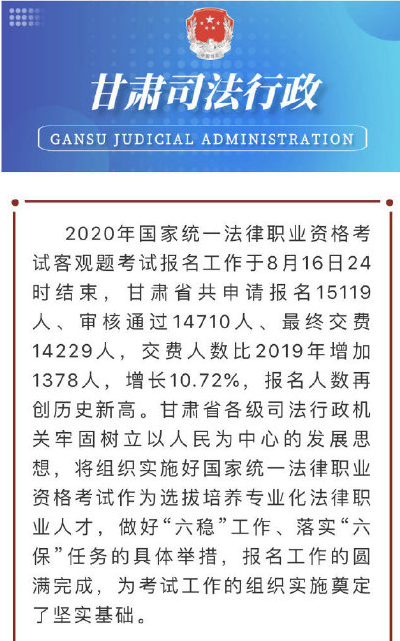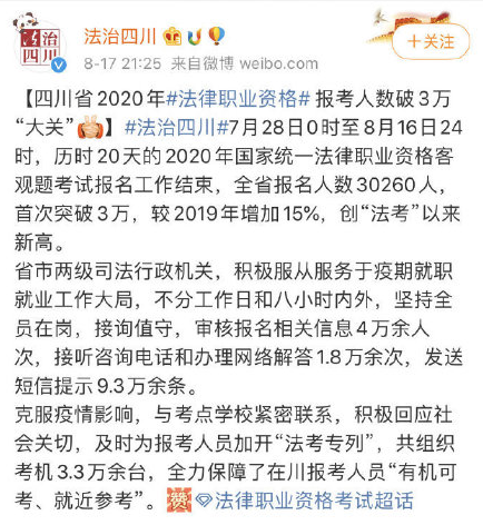 根据重庆发布的消息显示,全市共有14504名考生报名,比去年增加了1900余人,增幅15.34%左右,法考报名人数创历年新高。两天之内报考人数就已经破了2万。在报考人员分布方面,法律类专业的占到55.92%,法院、检察院及其他法律职业占到21.93%,在校大三、大四年级学生占到35.18%。