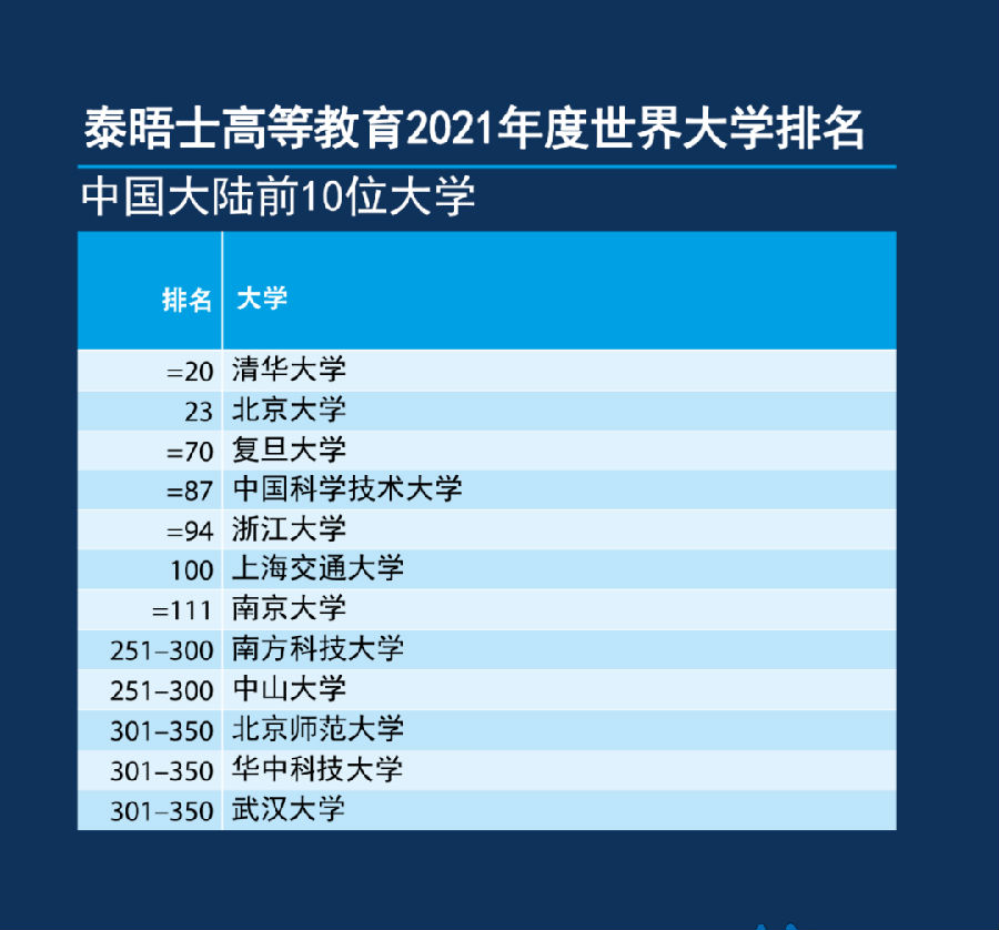 今日,英国泰晤士高等教育就发布了这样一则排名,对2021年度世界范围内的大学进行排序,清华大学与去年相比上升了3名,也是2011年唯一一所进入世界大学前20名的亚洲高校。清华北大的实力不必多言,这次除了清华,还有哪些院校也榜上有名呢?中国大陆共有91所大学在列,在前一百名中,还有北京大学第23名、复旦大学第70名、中国科学技术大学第87名、浙江大学第94名、上海交通大学第100名。