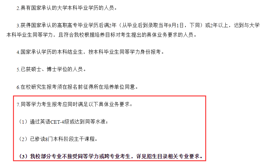 2021年暨南大学招生简章对同等学力报考要求比较明确,而且部分专业是不接受同等学力考生的,这就要求大家在决定考研时首先要了解目标院校的报考要求,看看自己是否满足条件。