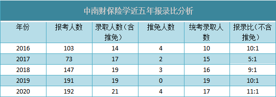 可以看出,近五年来中南财保险学报考人数持续走高,报录比也跟着提高,报考难度越来越大了。