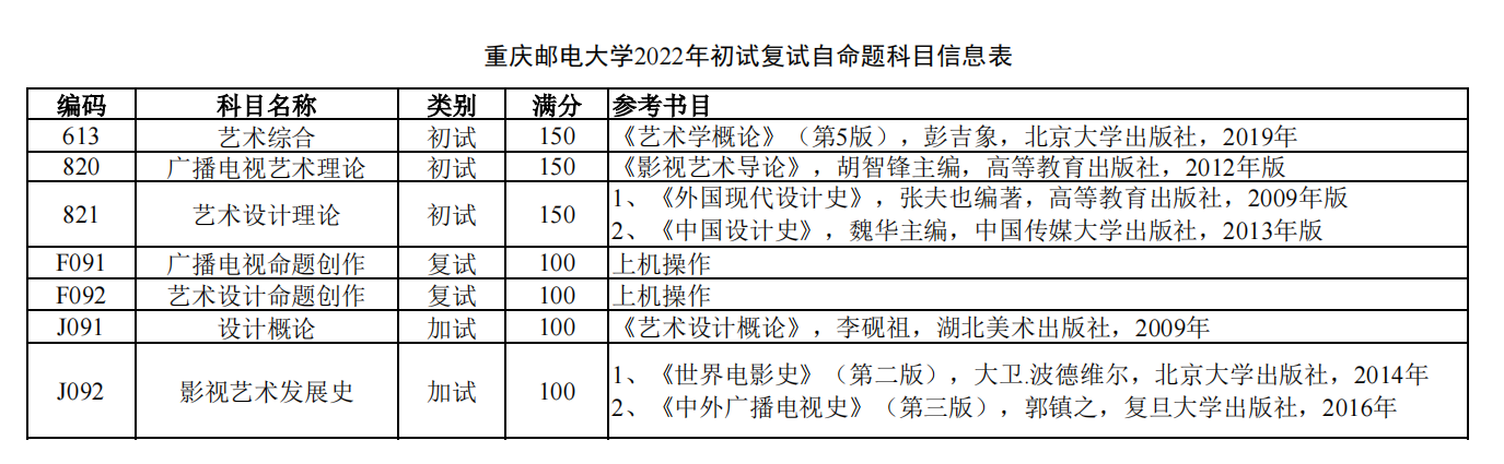 重庆邮电大学考研辅导班:2022年重庆邮电大学传媒艺术学院硕士研究生考试科目及参考书
