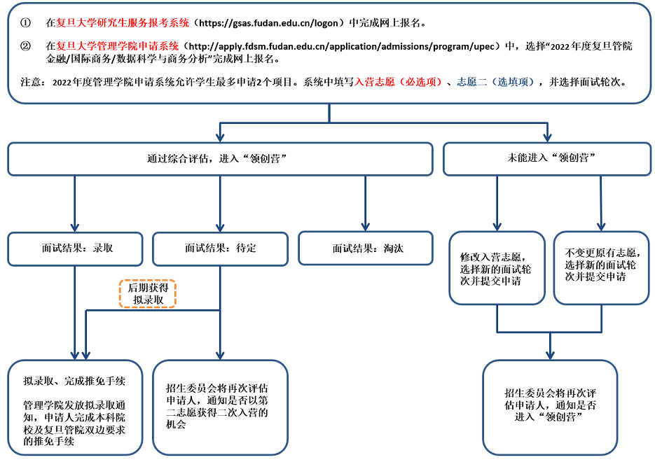 ◆ 个人英文视频(60秒以内本人出镜英文展示,请上传至百度网盘分享,密码统一设置为UPEC); ◆ 证件照、成绩单(含第二学位或专业的成绩单)及其他证明文书扫描文档; ◆ 副教授及以上或业界专家推荐信2封,需在系统中输入推荐人的邮箱(请使用推荐人的官方邮箱),系统将自动发送推荐信链接至邮箱。 五、申请流程 ◆ 学生申请入营时,原则上需在院系统和校系统同时注册和申请。校系统开启注册时间待复旦大学研究生院而定,一旦开放,所有申请中/拟录取/待定的申请人都需在第一时间内完成双系统填写,前期已参营的学生需立即填写方可保留预录取/待定资格。如有其他申请意向,我院在申请人提交退出申请后可作两系统撤销处理。 院系统: http://apply.fdsm.fudan.edu.cn/application/admissions/program/upec 校系统: https://gsas.fudan.edu.cn/logon ◆ 申请我院的2022年度申请人请按照以下流程完成学院和学校系统的网上系统报名,无需邮寄任何纸质材料。 特别注意 1. 2022年,我院仍接受每个申请人填报两个志愿,且对两个志愿不设限制(GMiM和GMIF亦可同时申请,但只能入营一次)。申请人如第一志愿未录取仍有以第二志愿录取的可能。学生在系统中填写入营志愿一(必填项)、志愿二(选填项)。招生委员会将根据学生背景和整体申请情况决定申请人以第一或第二志愿入营,但原则上以第一志愿为优先考虑。未获得该轮次入营资格的申请人,允许修改志愿并重新提交申请表,进入后续领创营的入营选拔。 2.入营且面试结果为“待定”的申请人,有机会在后续“领创营”结束后获得预录取资格。获得“待定”的申请人亦有通过第二志愿获得预录取资格的可能。是否需再次入营参加第二志愿的选拔以招生委员会综合评估结果为准。 3.DDIM/GMIM/MIF/GMIF将采用一轮案例讨论+一轮面试考核方式。MFE/DS&BA将采用一轮笔试(分开出卷)+一轮面试考核方式。GMIM/GMIF以外项目今年将适度降低对英语口语的考核要求。 六、审核录取 “领创营”入营及最终录取结果将以E-mail和电话形式直接通知学生本人。所有通知将优先通过E-mail发送,请务必确保电子邮箱的地址正确和有效,并做到及时查收(注:请不要使用qq、hotmail、outlook和icloud邮箱)。 七、奖学金设置 注:GMIM和GMIF学业奖学金,MIF、MFE和DS&BA第二学年奖学金将根据第一学年成绩以及社会服务表现综合评定。 八、联系我们 复旦大学管理学院本硕博教育中心 电话:021-25011530、25011497、25011485 邮箱:upec@fudan.edu.cn 官网:www.fdsm.fudan.edu.cn/upec 微信:fdsm-upec “复旦管院本硕博教育中心”