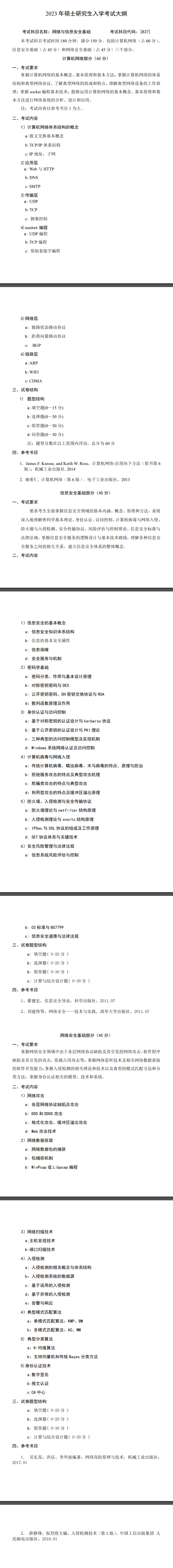 哈尔滨工业大学考研辅导班:2023年硕士研究生招生初试自命题科目参考大纲(837网络与信息安全基础)