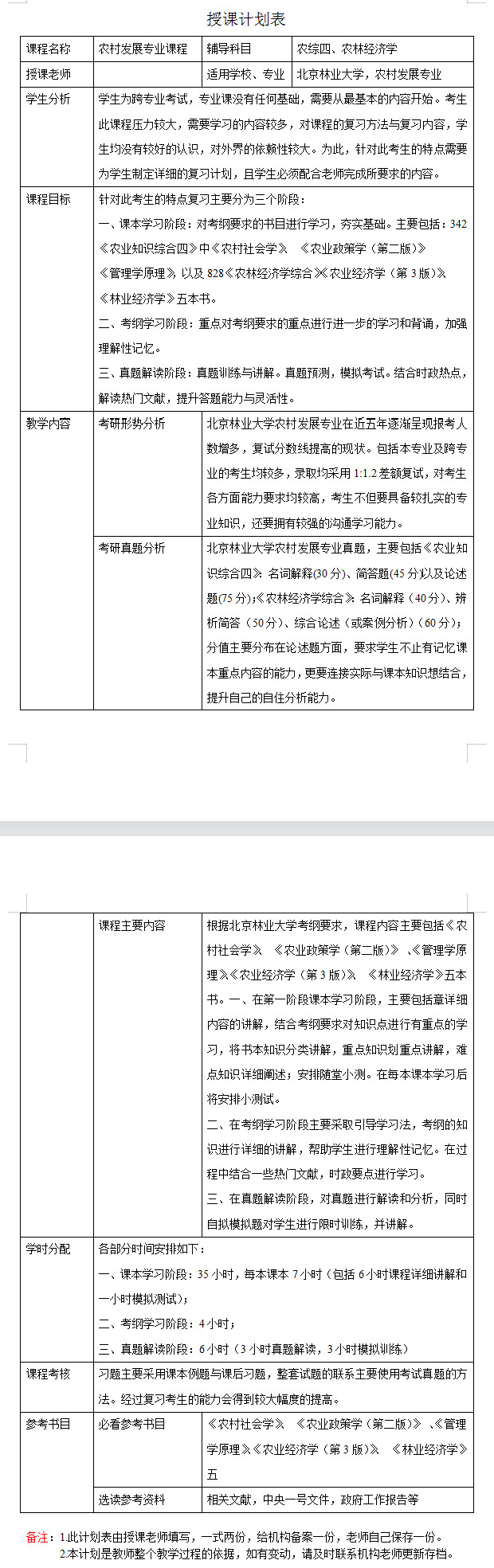 新祥旭考研一对一:2023年北京林业大学农村发展专业考研一对一辅导授课计划