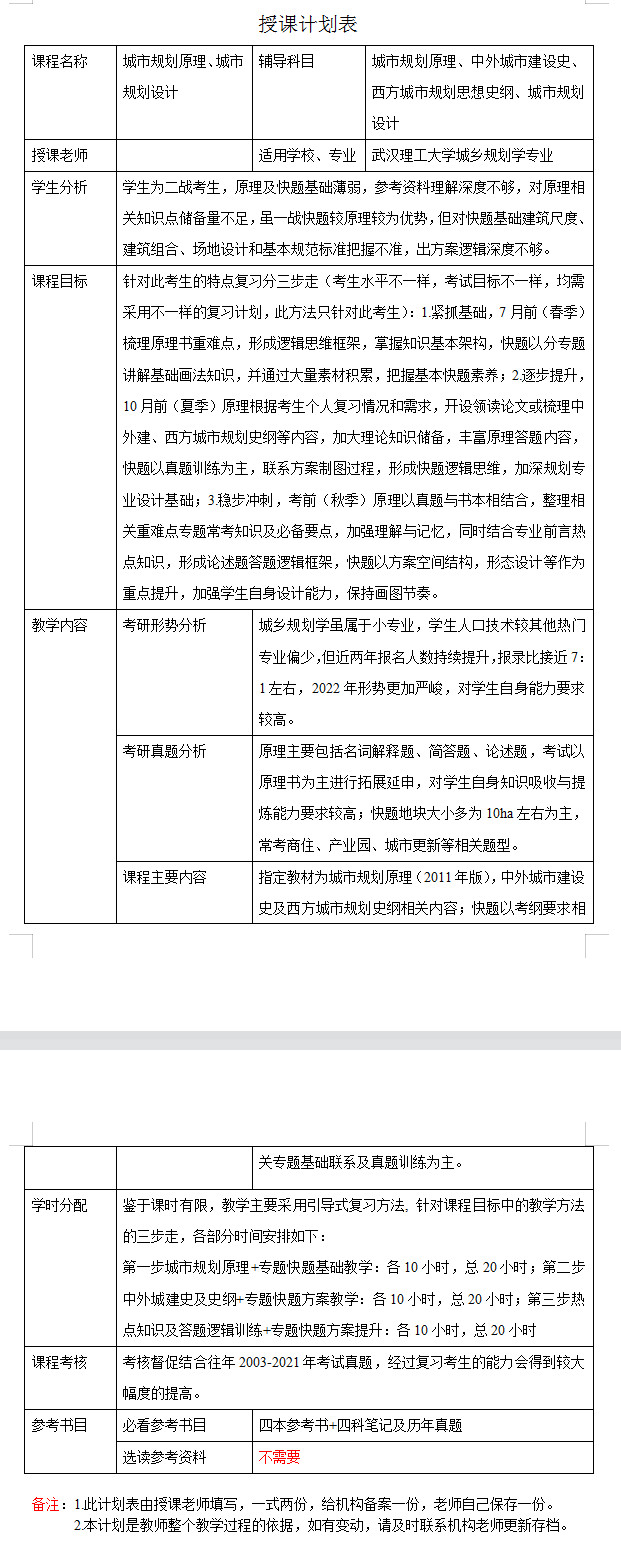 新祥旭考研一对一:2023年武汉理工大学城乡规划学考研一对一辅导授课计划