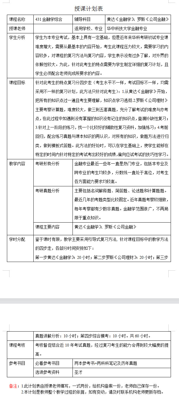 新祥旭考研一对一:2023年华中科技大学金融专硕考研一对一辅导授课计划