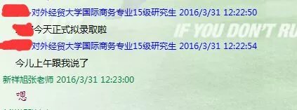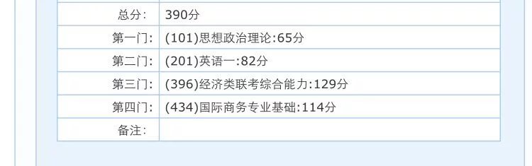 恭喜新祥旭2016届学员*璐同学以初试390分的好成绩考上对外经济贸易大学国际商务硕士,特此祝贺,愿*璐同学学业顺利,愿新祥旭教育再创辉煌!(欢迎关注微信公众号:对外经贸考研联盟dwjmkylm)