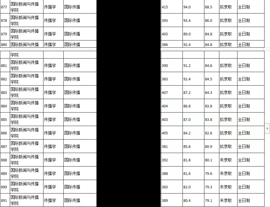 传播学专业2020年-2022年三年的复试分数线分别为390分、392分、381分;录取人数分别为11人、6人、11人,报录比官方不公开,复试录取率为61.1%、75%、73.3%,录取率逐年增长。总体来说北外的新传(包括学硕和专硕)近年来有扩招趋势,少数几次调剂都是在校内或院内进行的,非常保护一志愿。考试难度比较中等,特色在于对英语水平有较高要求,学硕的其中一门专业课要求全英文答题(题型涉及双语新闻编译、评论写作、报道策划等),不过最近一次初试出现了60分的中文题,这点需注意。