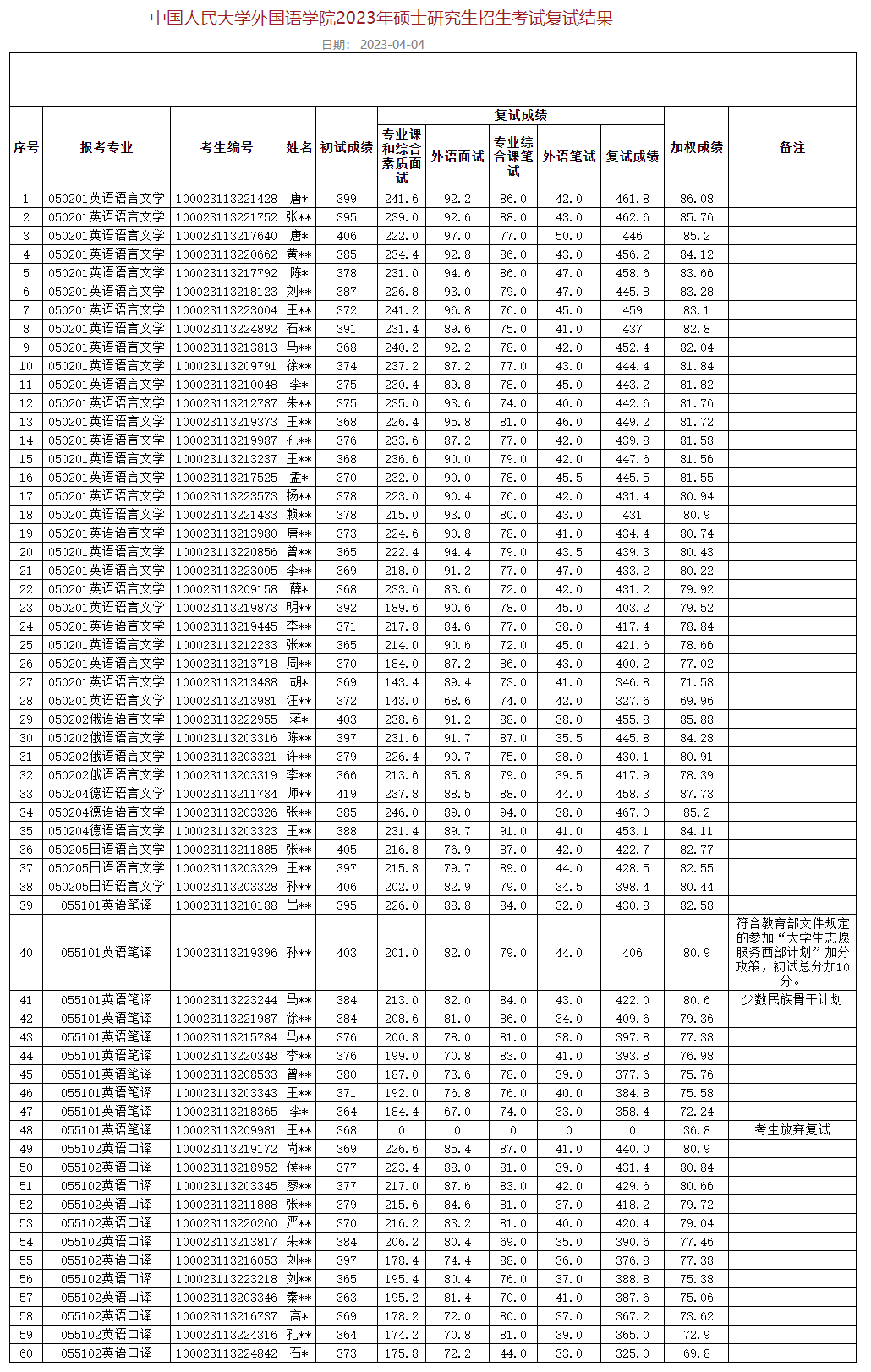 新祥旭考研:中国人民大学外国语学院2023年硕士研究生招生考试复试结果