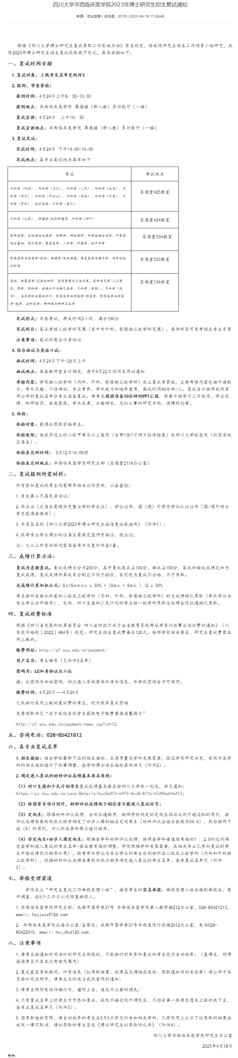 知点考博:四川大学华西临床医学院2023年博士研究生招生复试通知