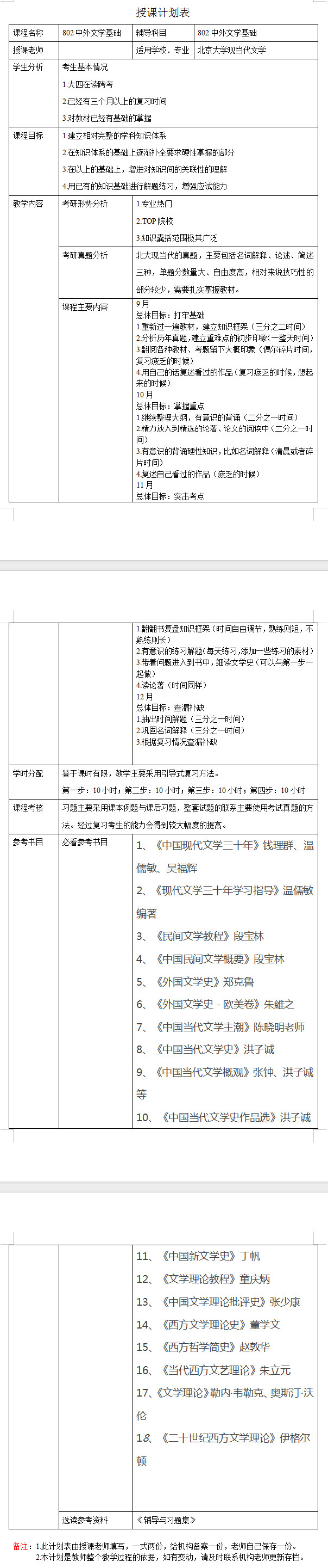 新祥旭考研:2024年北京大学中国现当代文学802中外文学基础考研一对一授课计划