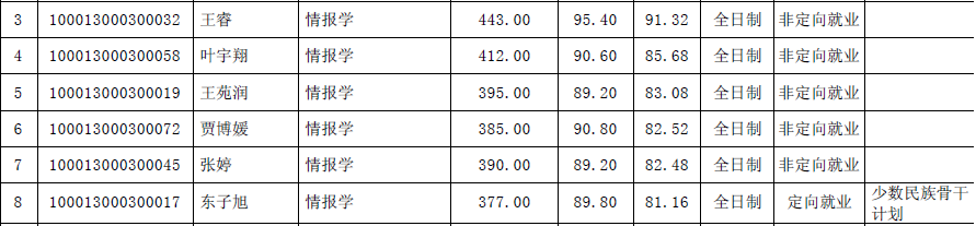 2021年:10人进入复试(最高分416、最低分378、强军计划3名349、315、315);录取8人(最高分416、最低分386、少干计划1名398、强计划3名315、315、295)