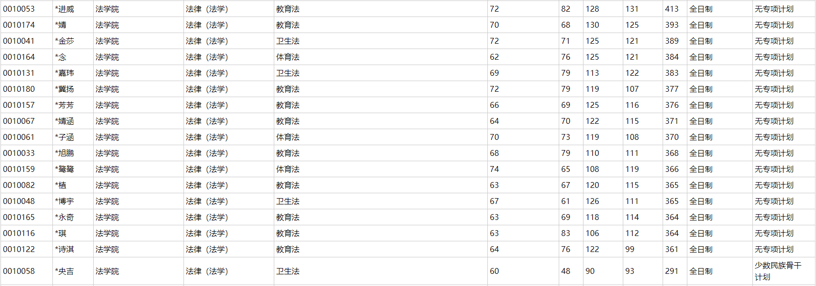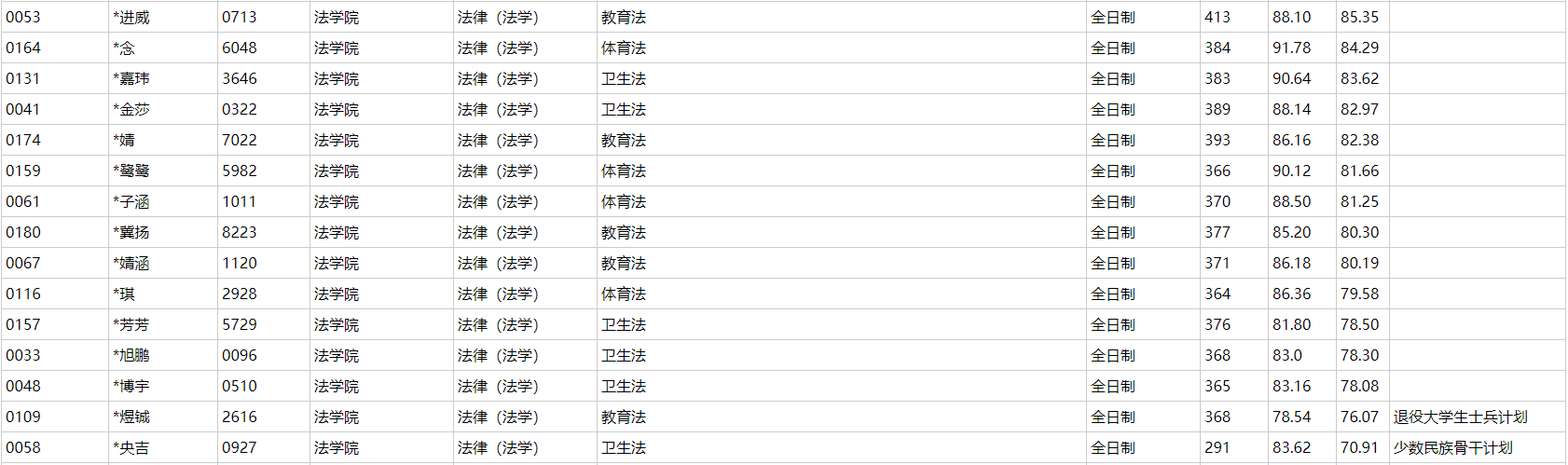 2023年:17人进复试(最高分413、最低分一名少数民族骨干计划291);录取15人(最高分413、最低分一名少数民族骨干计划291)