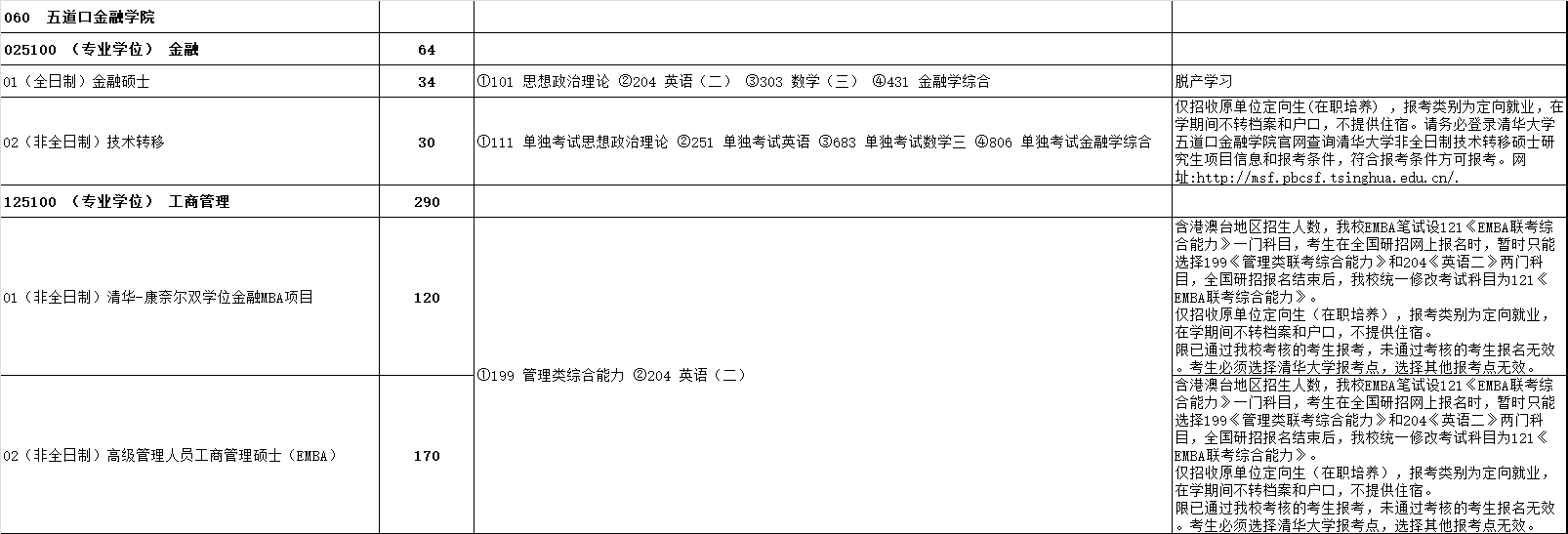 清华大学五道口金融学院2024年硕士研究生统考招生专业目录、考试科目、招生人数