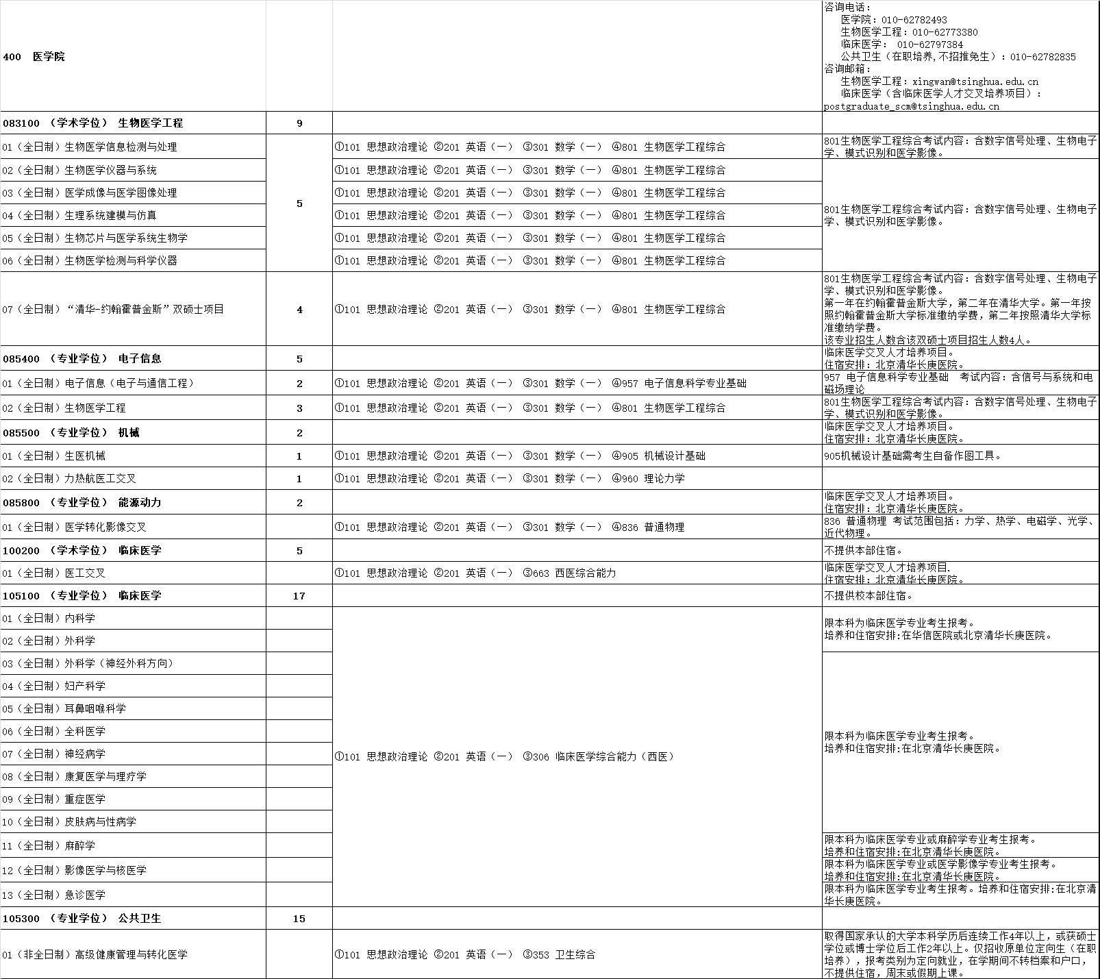清华大学医学院2024年硕士研究生统考招生专业目录、考试科目、招生人数