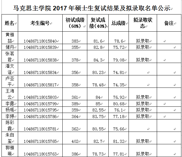 马克思主学院2017年硕士生复试结果及拟录取名单公示