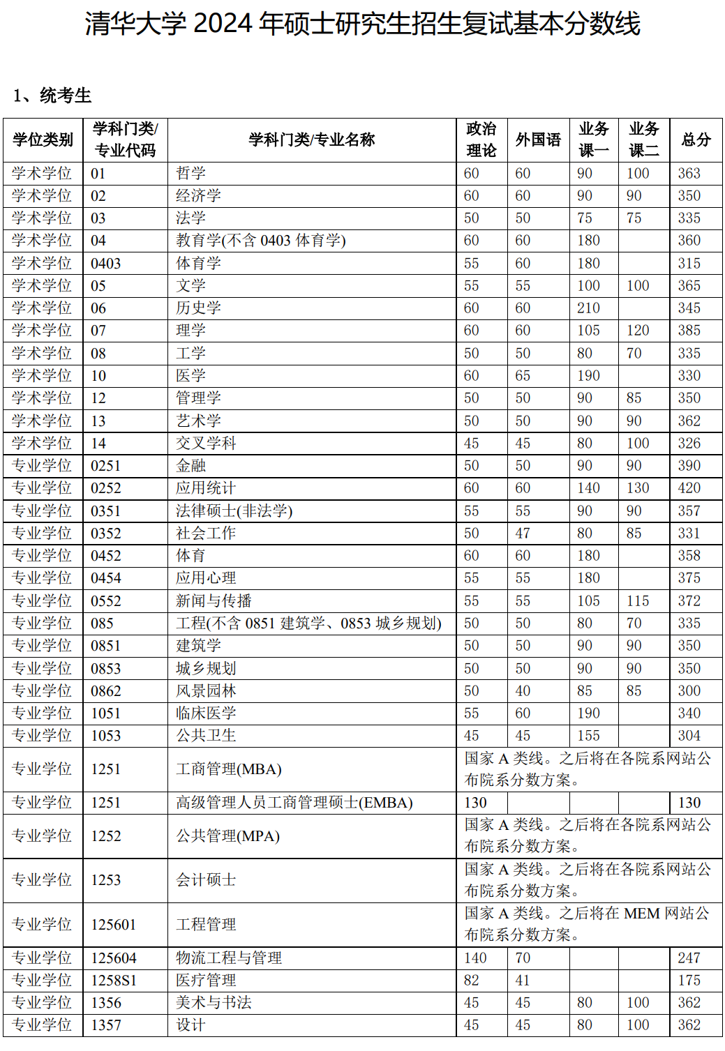 2024年清华大学硕士研究生招生复试基本分数线