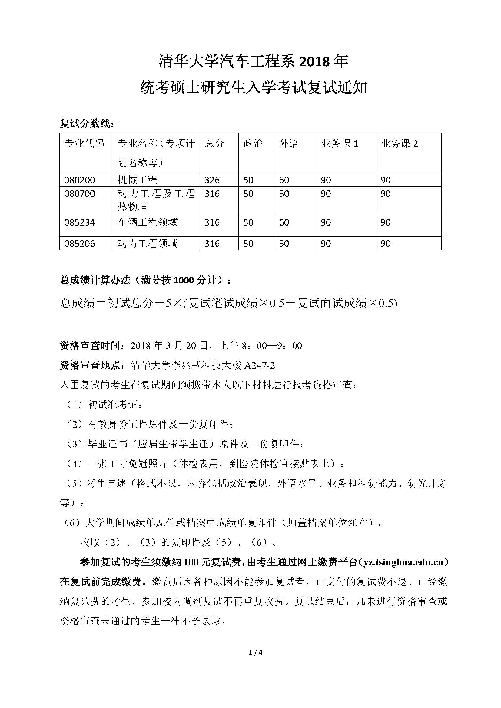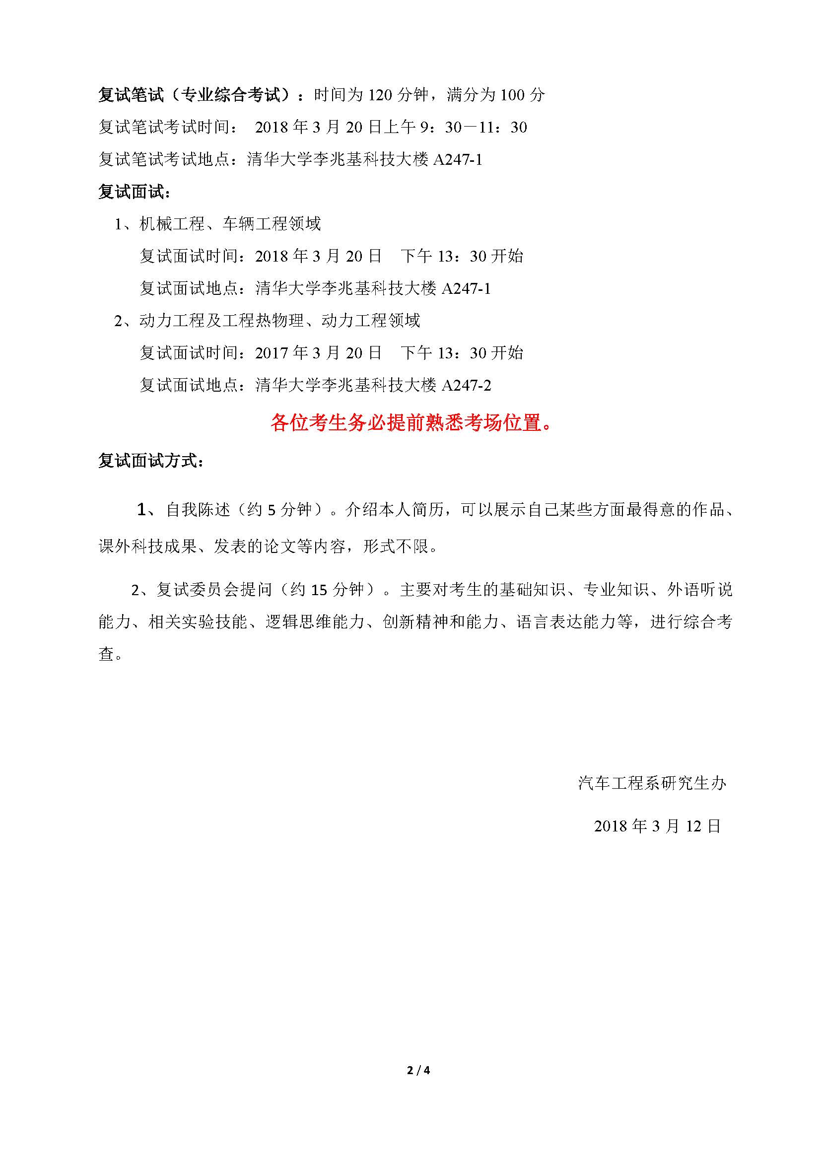 清华大学热能工程系2018年硕士生复试分数线、复试名单、复试安排