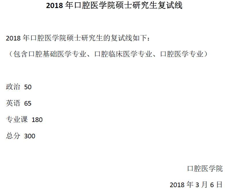 同济大学口腔医学院2018年硕士研究生复试分数线