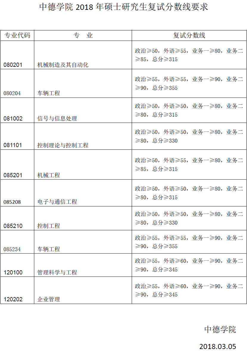 同济大学中德学院2018年硕士研究生复试分数线