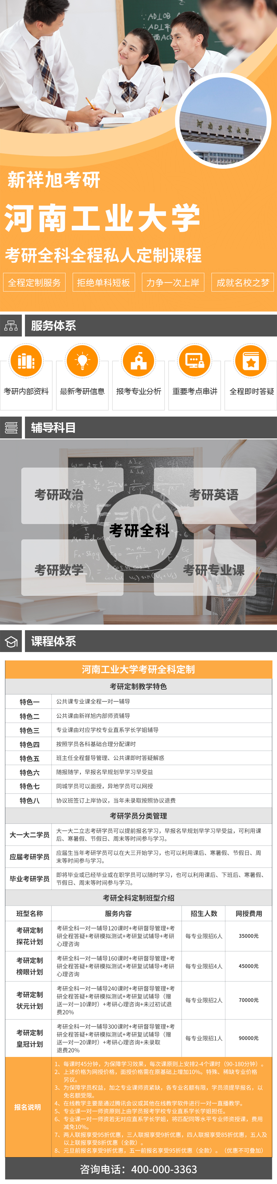 课程描述:新祥旭考研专注河南工业大学考研全科定制辅导,以效果为导向,以上岸为目标,为广大考研学生提供个性化、定制化、多对一的考研全科全程辅导,考研公共课和考研专业课皆为一对一辅导,全国各地考研学生可以面授也可以网授,力争让考研学生顺利考取河南工业大学攻读硕士研究生。
