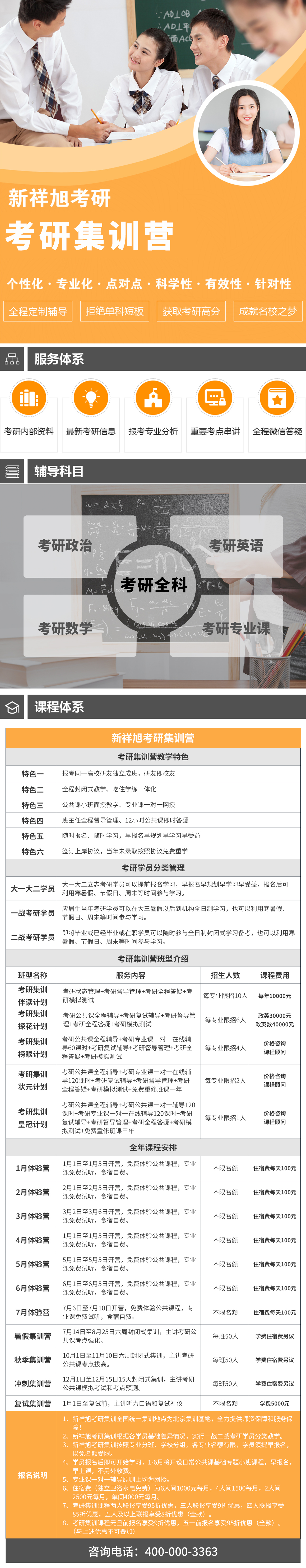 课程描述:新祥旭考研暑假集训营,专为积极备战考研的一战或二战学员而准备。每年7月上旬至8月下旬集中开班。政治、英语、数学小班教学,专业课在线一对一辅导,班主任全程督导、课后全程答疑、定期组织摸底考试。封闭式寄宿制全日制管理,吃住学一体化,确保学习环境和学习效果!